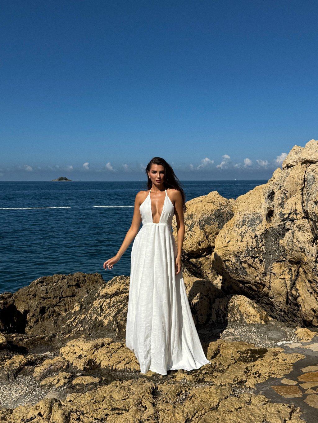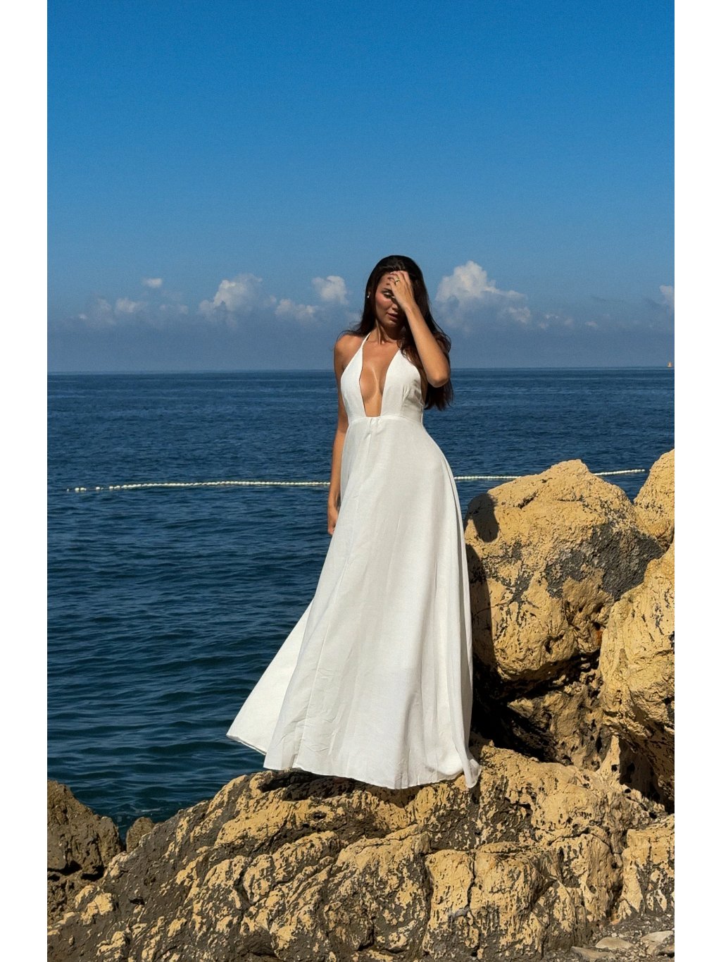 Tyto dlouhé bílé šaty jsou stvořené pro letní dny a dovolenou plnou pohody. Jejich lehký a vzdušný materiál zajišťuje komfort po celý den a zároveň vytváří elegantní a nadčasový vzhled.