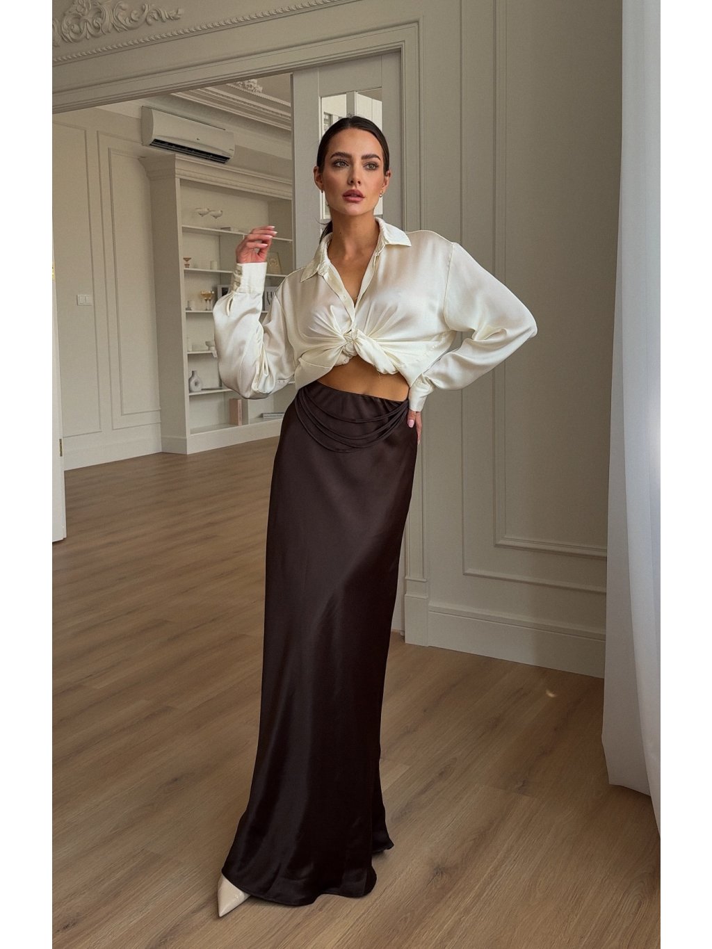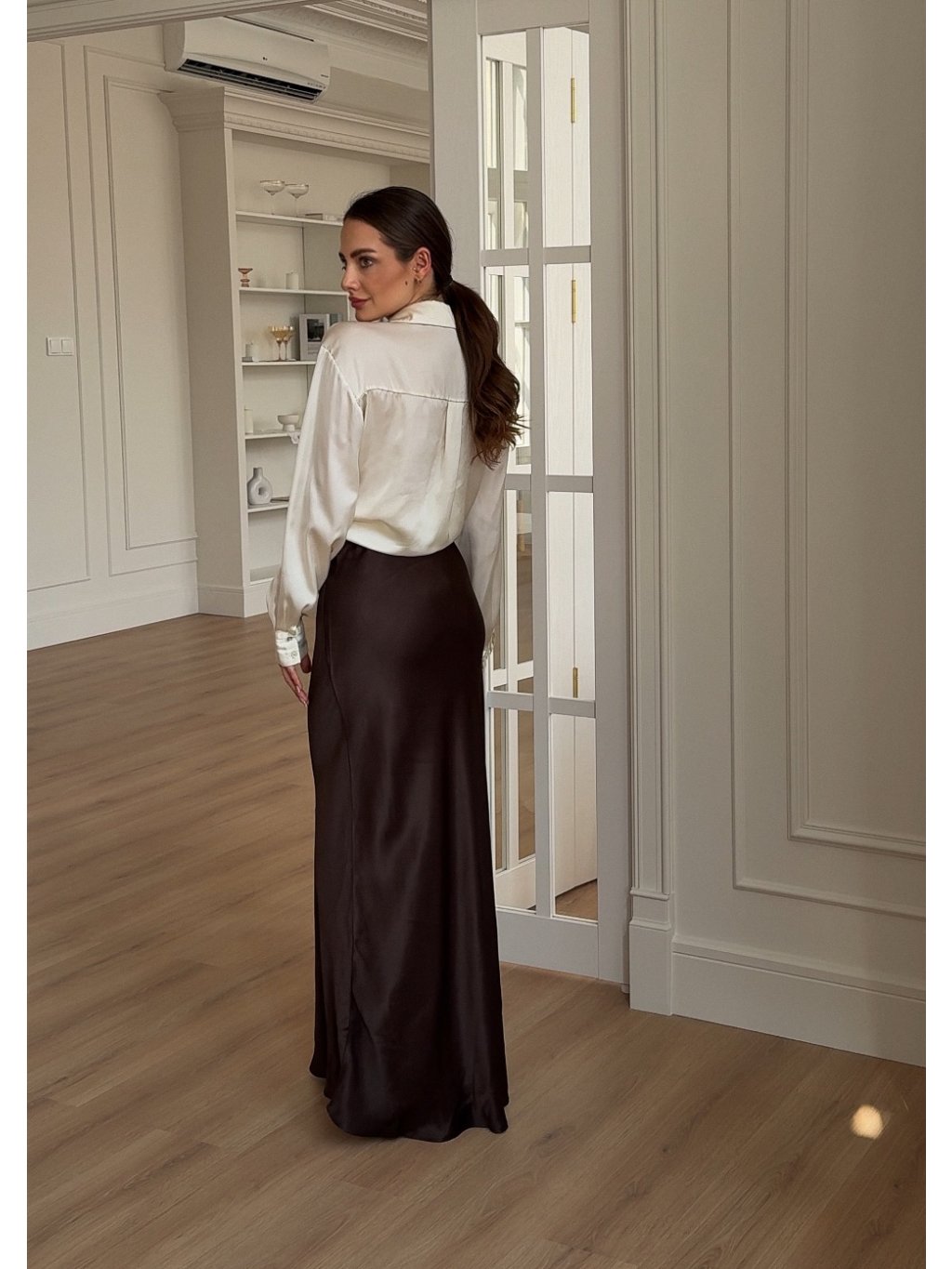 Hnědá dlouhá sukně z materiálu připomínajícího satén je ideálním spojením elegance a pohodlí. Díky jemnému lesku působí luxusně, ale přesto zůstává nadčasová a minimalistická – přesně taková, jakou ve skříni využiješ na nespočet způsobů. Snadno ji zkombinuješ s jednoduchým topem i košilí, vynikne s podpatky i se sandálky. Její lehký materiál krásně splývá a dodává outfitu sofistikovaný šmrnc, ať už se chystáš na běžný den ve městě nebo večerní příležitost.