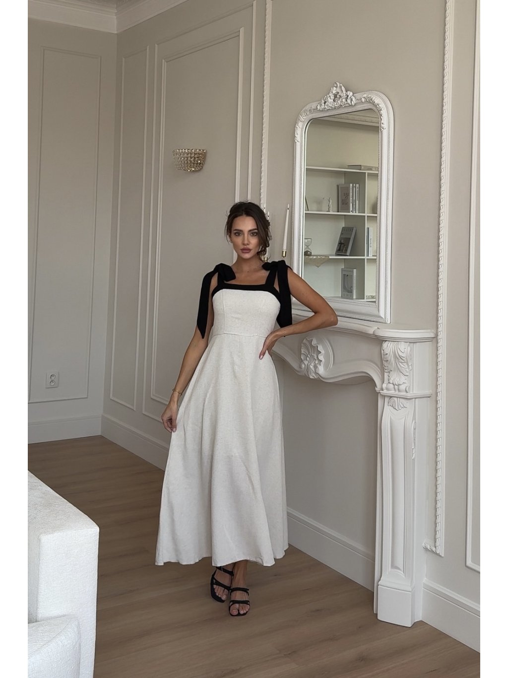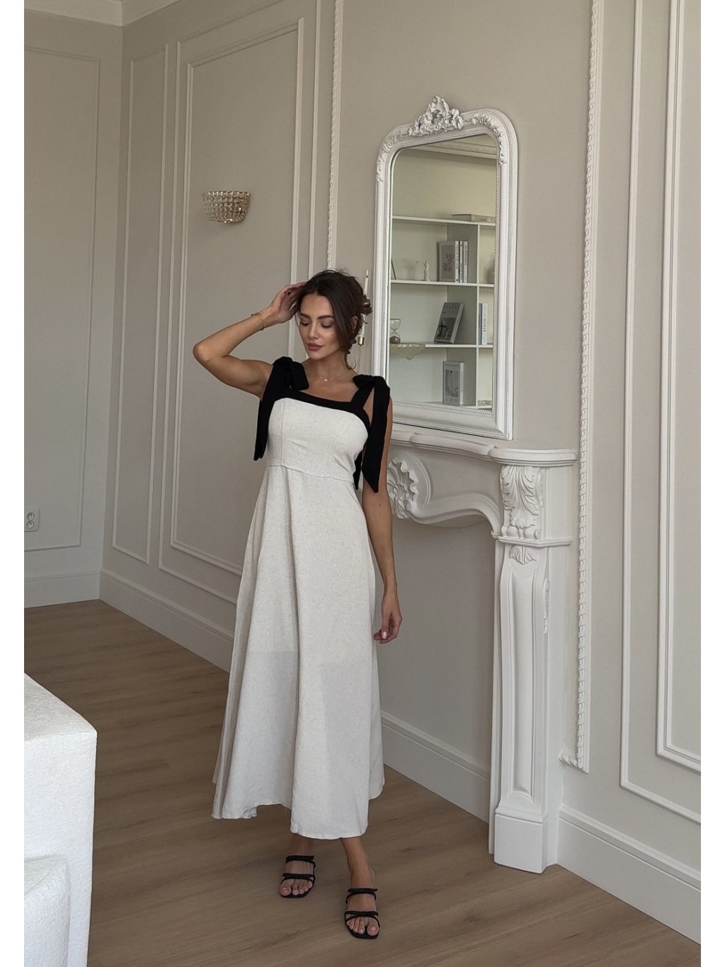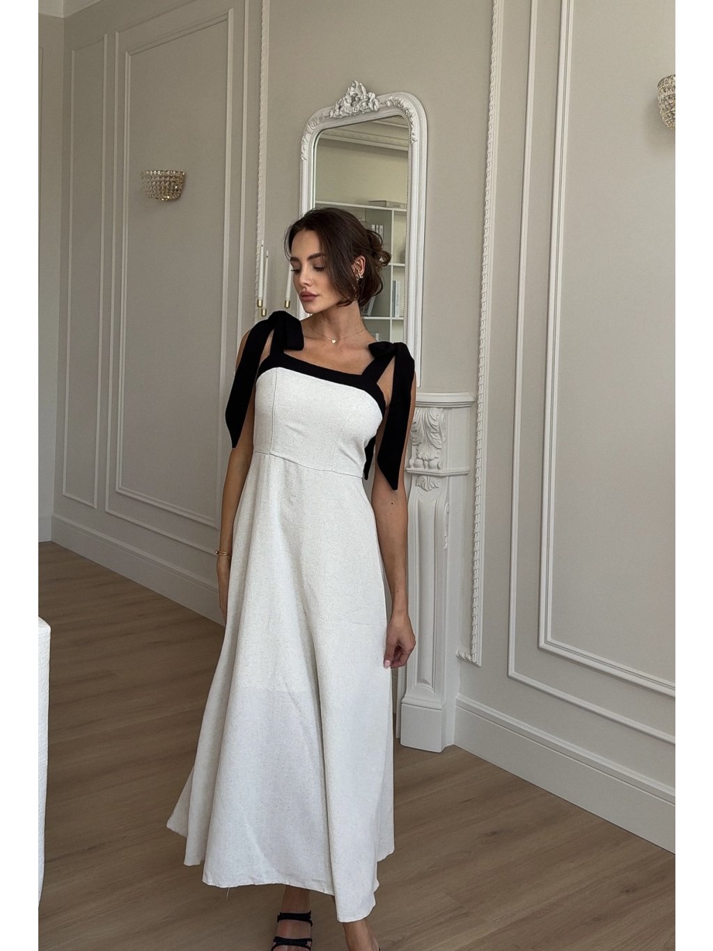 Tyto béžové lněné šaty kombinují klasický střih s jemným detailem – mašličkovým vázáním na ramenou. Vyrobeny z 100 % lnu, který je lehký, prodyšný a příjemný na nošení. Perfektní volba pro každodenní nošení, letní procházky i elegantní příležitosti. Díky svému střihu lichotí všem typům postav a mašličky dodávají šatům jemný, ženský detail.