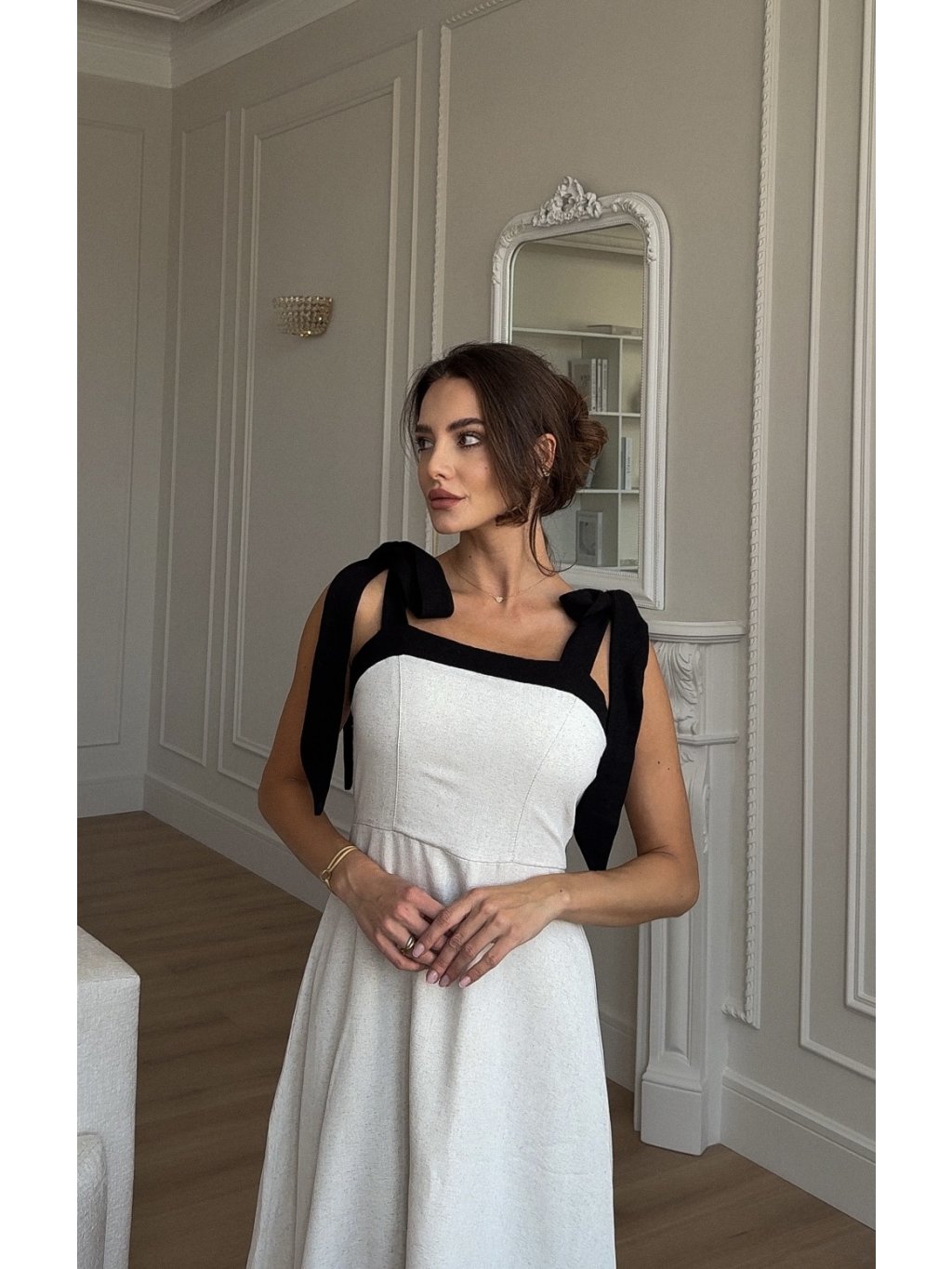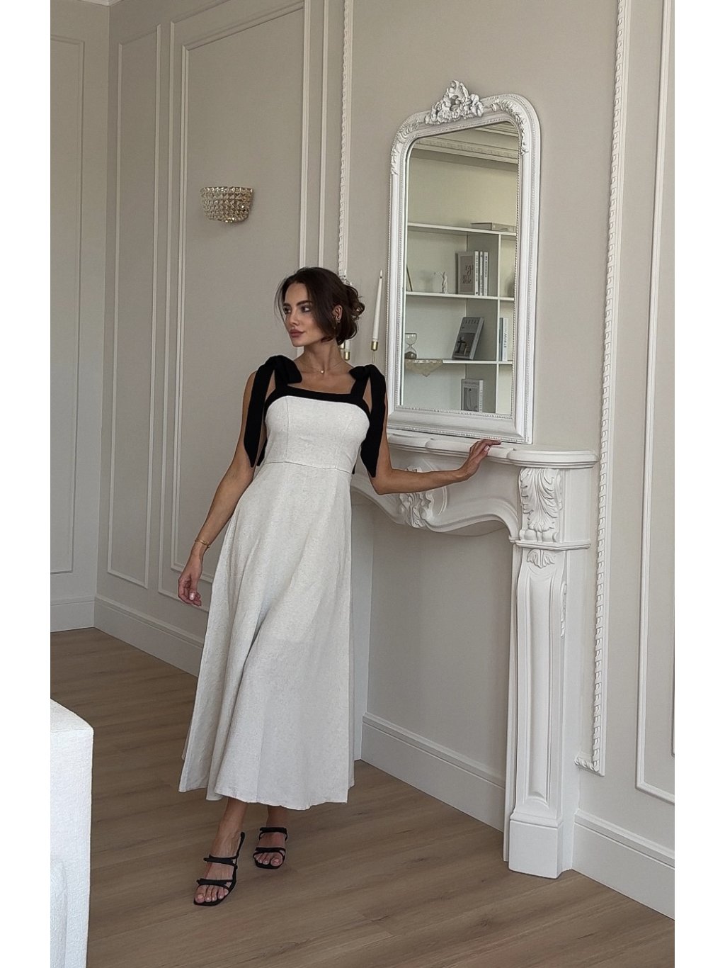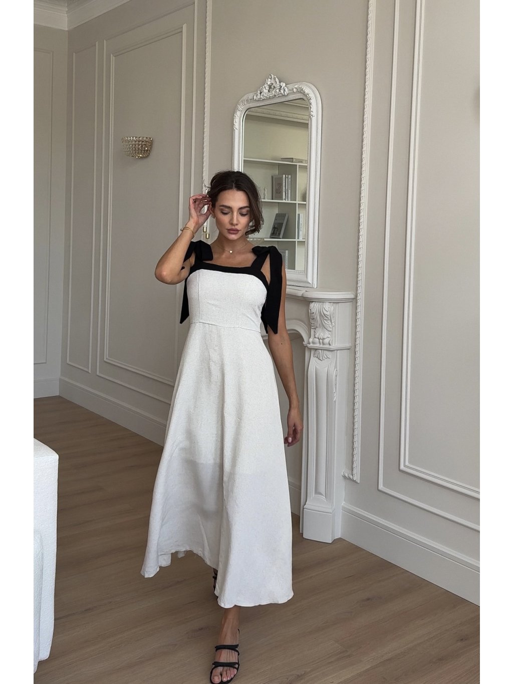 Tyto béžové lněné šaty kombinují klasický střih s jemným detailem – mašličkovým vázáním na ramenou. Vyrobeny z 100 % lnu, který je lehký, prodyšný a příjemný na nošení. Perfektní volba pro každodenní nošení, letní procházky i elegantní příležitosti. Díky svému střihu lichotí všem typům postav a mašličky dodávají šatům jemný, ženský detail.