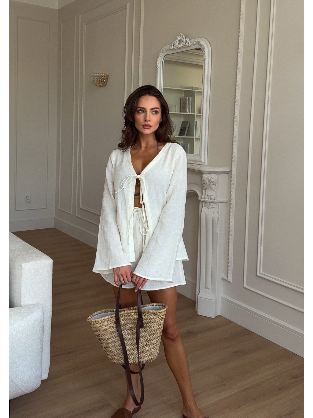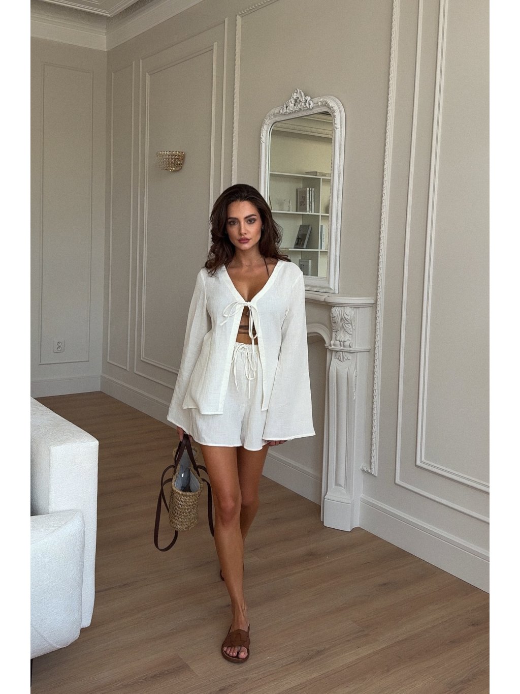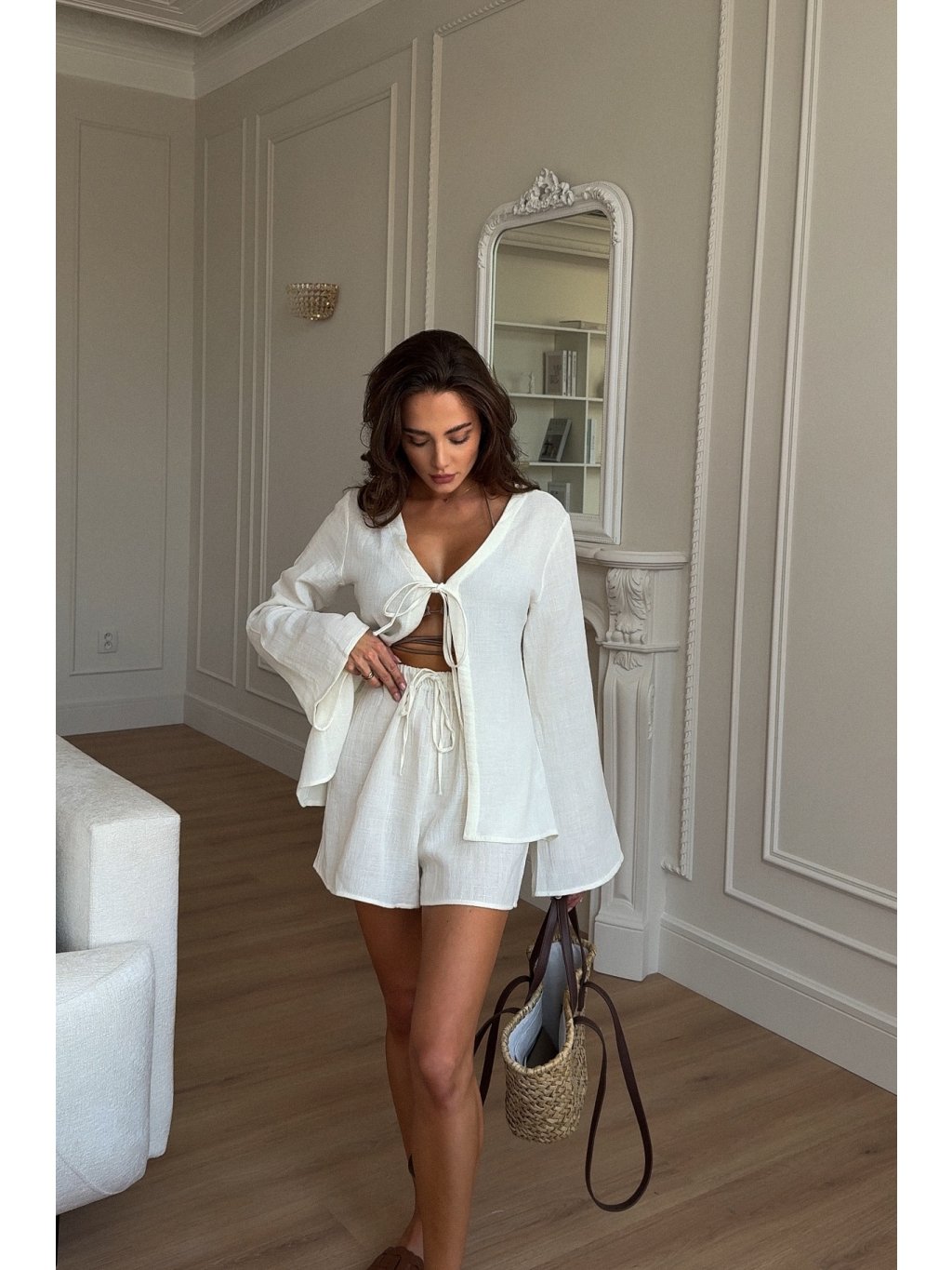 Bílý lněný komplet Holiday kombinuje pohodlnou halenku a stylové kraťasy, ideální pro letní dovolenou. Vyroben z 100 % lnu, který je lehký, prodyšný a příjemný na nošení. Komplet poskytuje svobodu pohybu a nadčasový vzhled, který lichotí všem typům postav. Perfektní pro plážové procházky, letní setkání s přáteli nebo odpočinkové dny plné slunce.