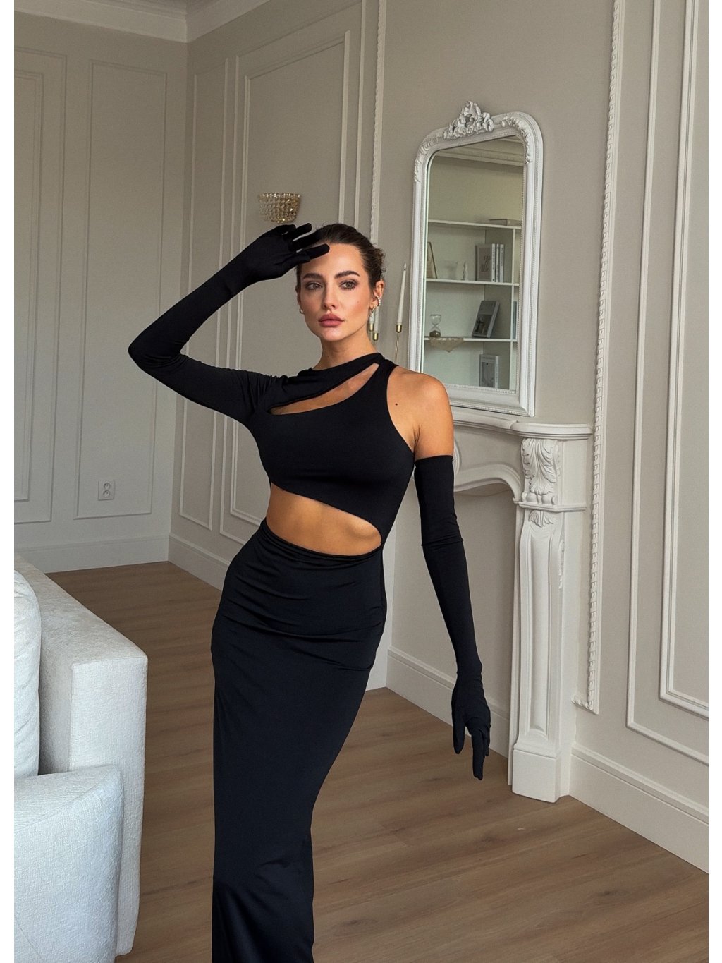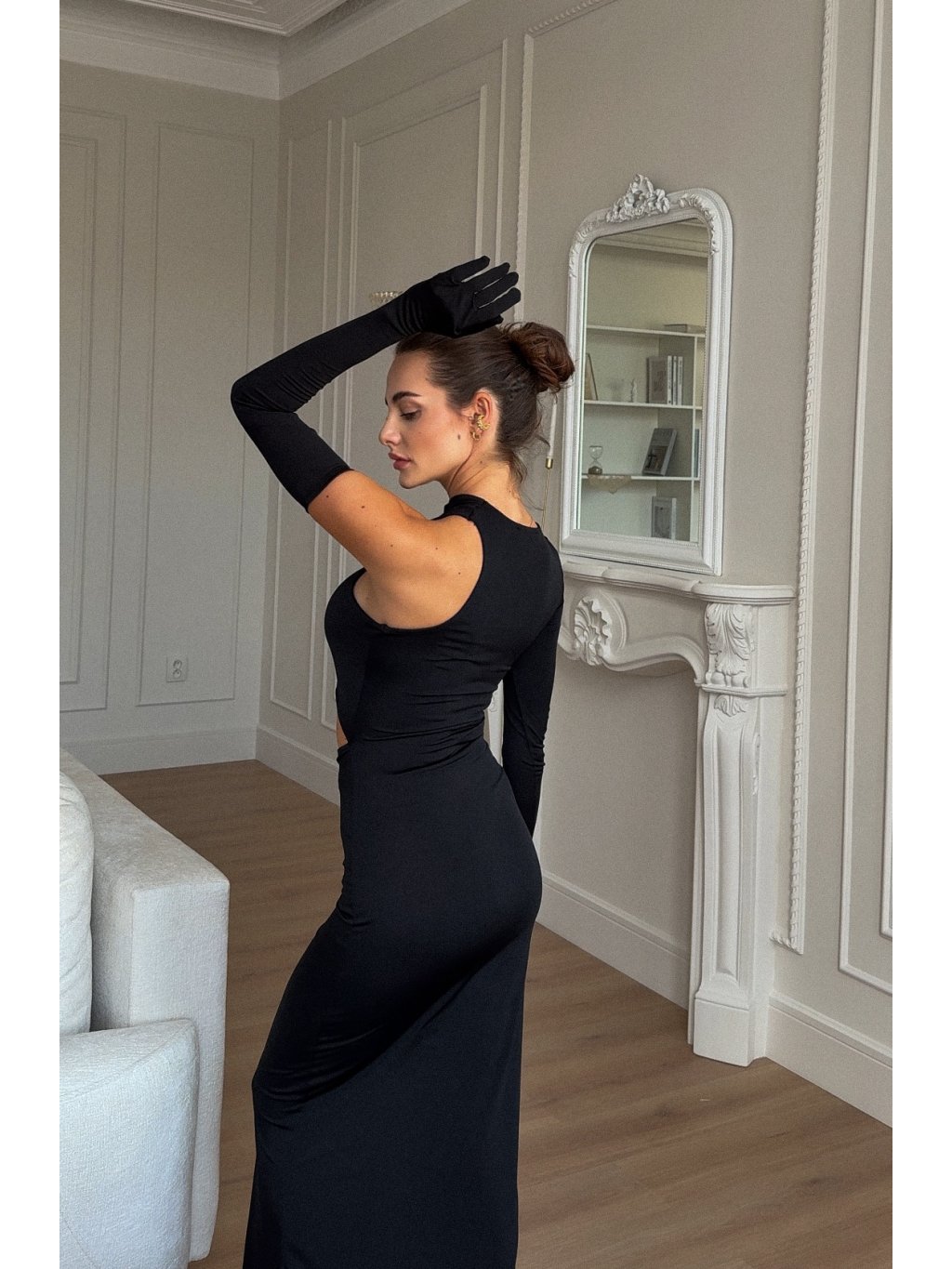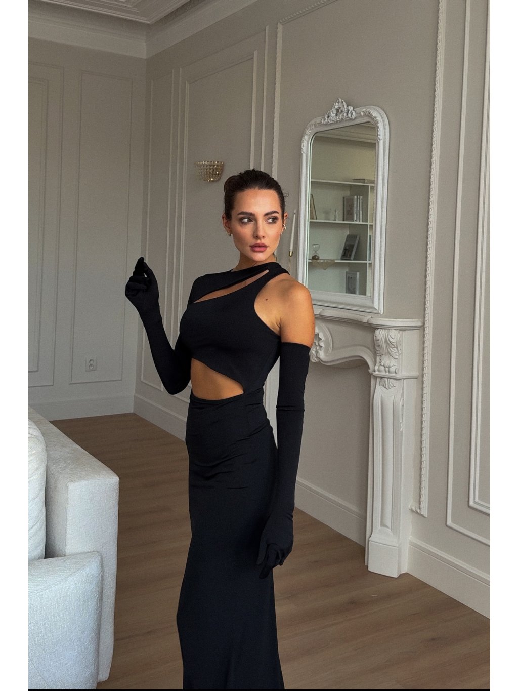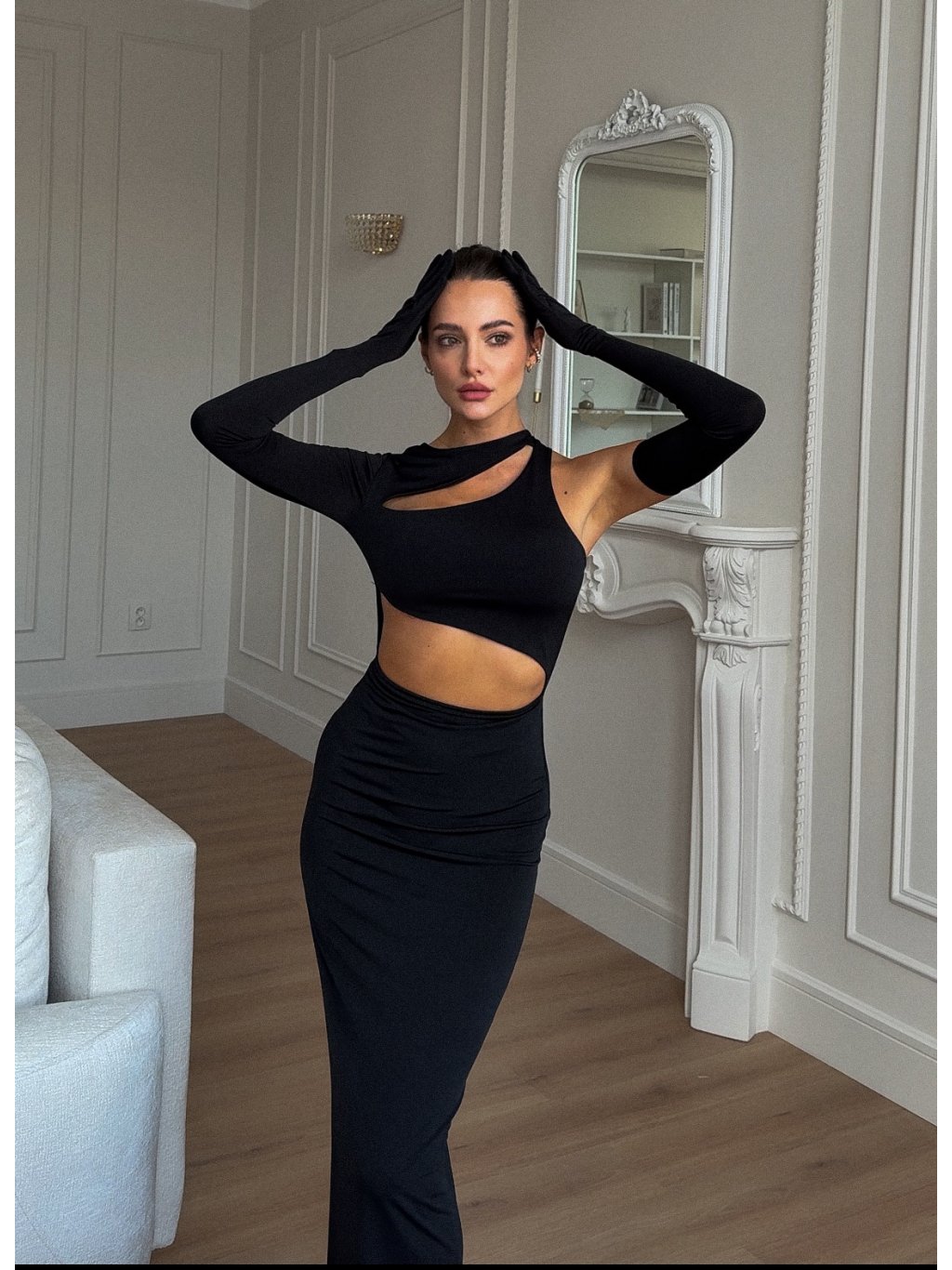 Tyto černé šaty jsou elegantní, sexy a velmi úplé, dokonale kopírují siluetu a zdůrazňují ženskou postavu. Originální rukavičky dodávají šatům sofistikovaný a odvážný detail. Ideální volba na večerní akce, stylové večery nebo speciální příležitosti, kdy chcete působit sebevědomě a výrazně. Vhodné na drobnější postavy.