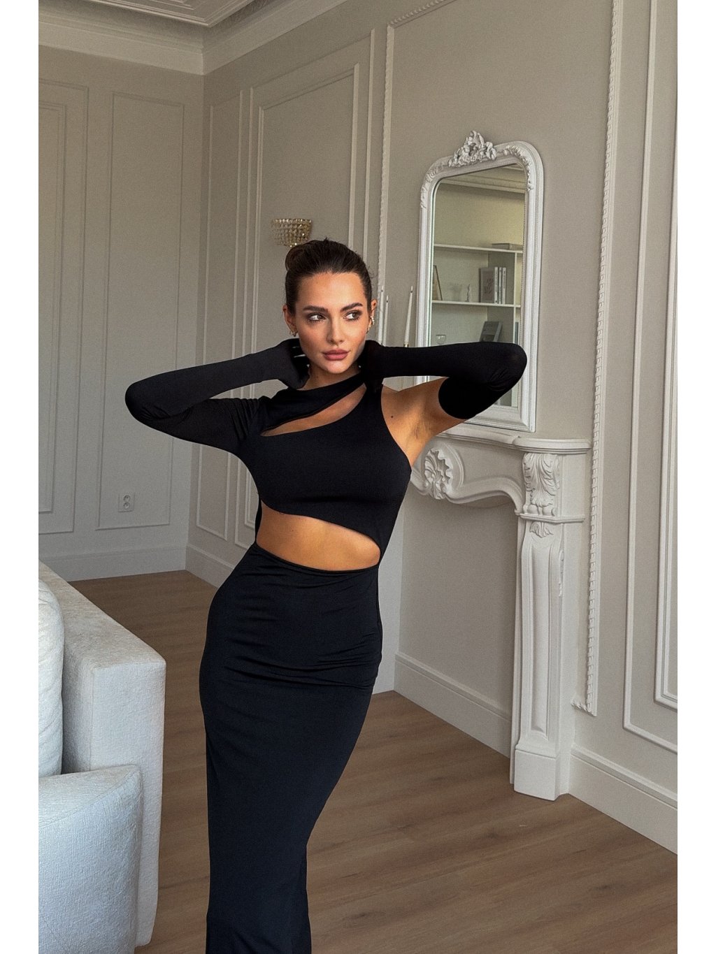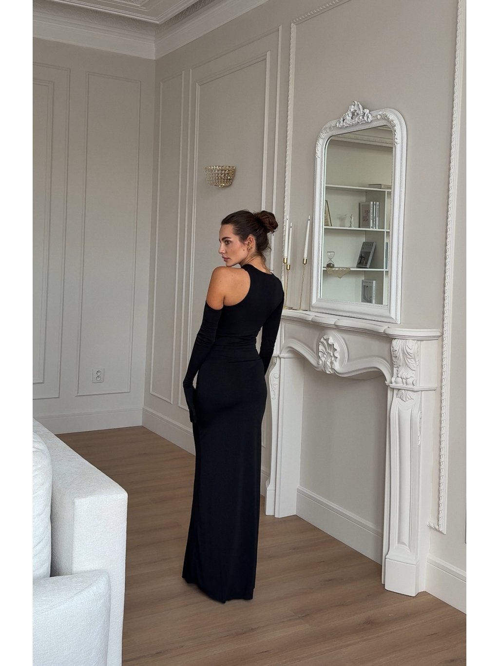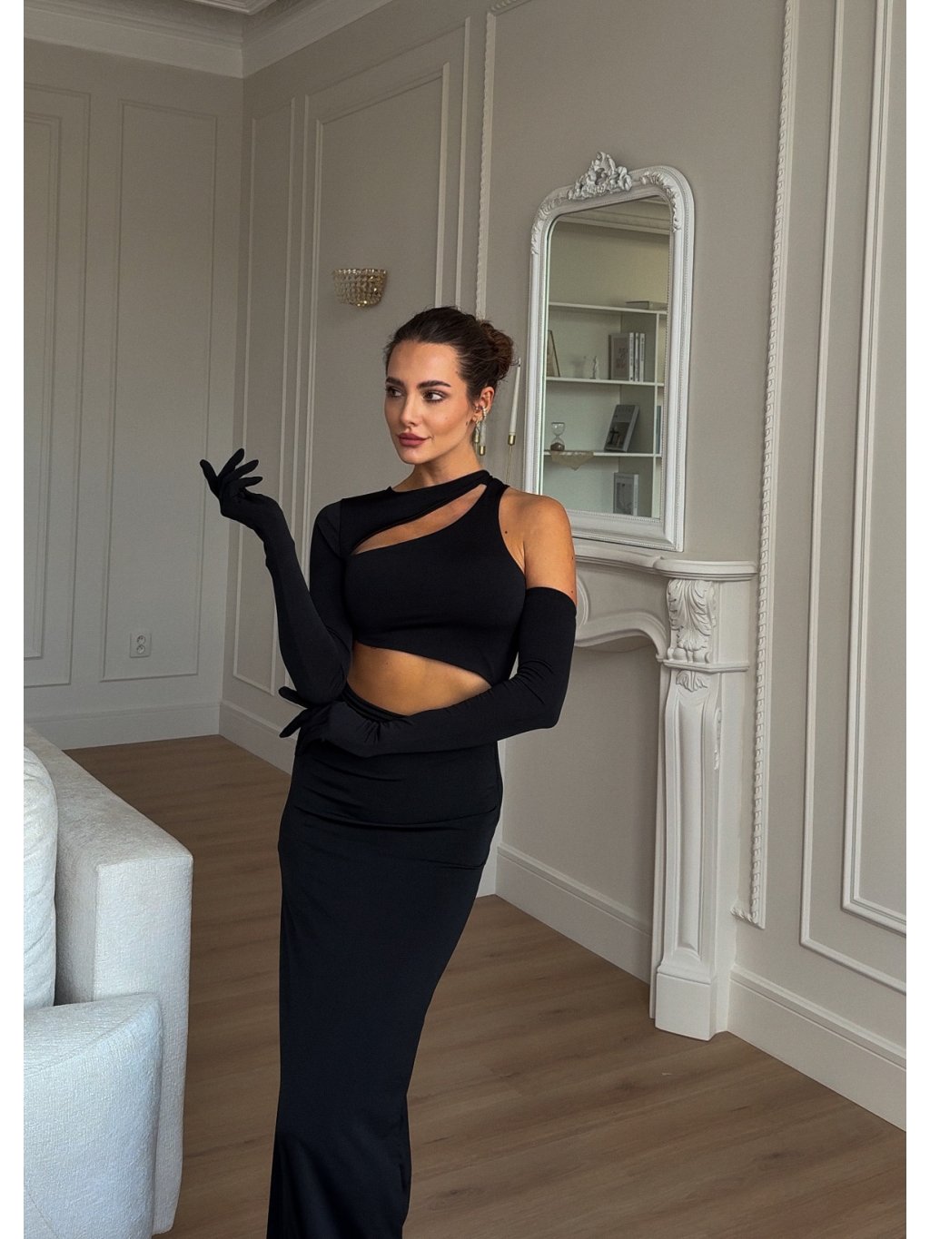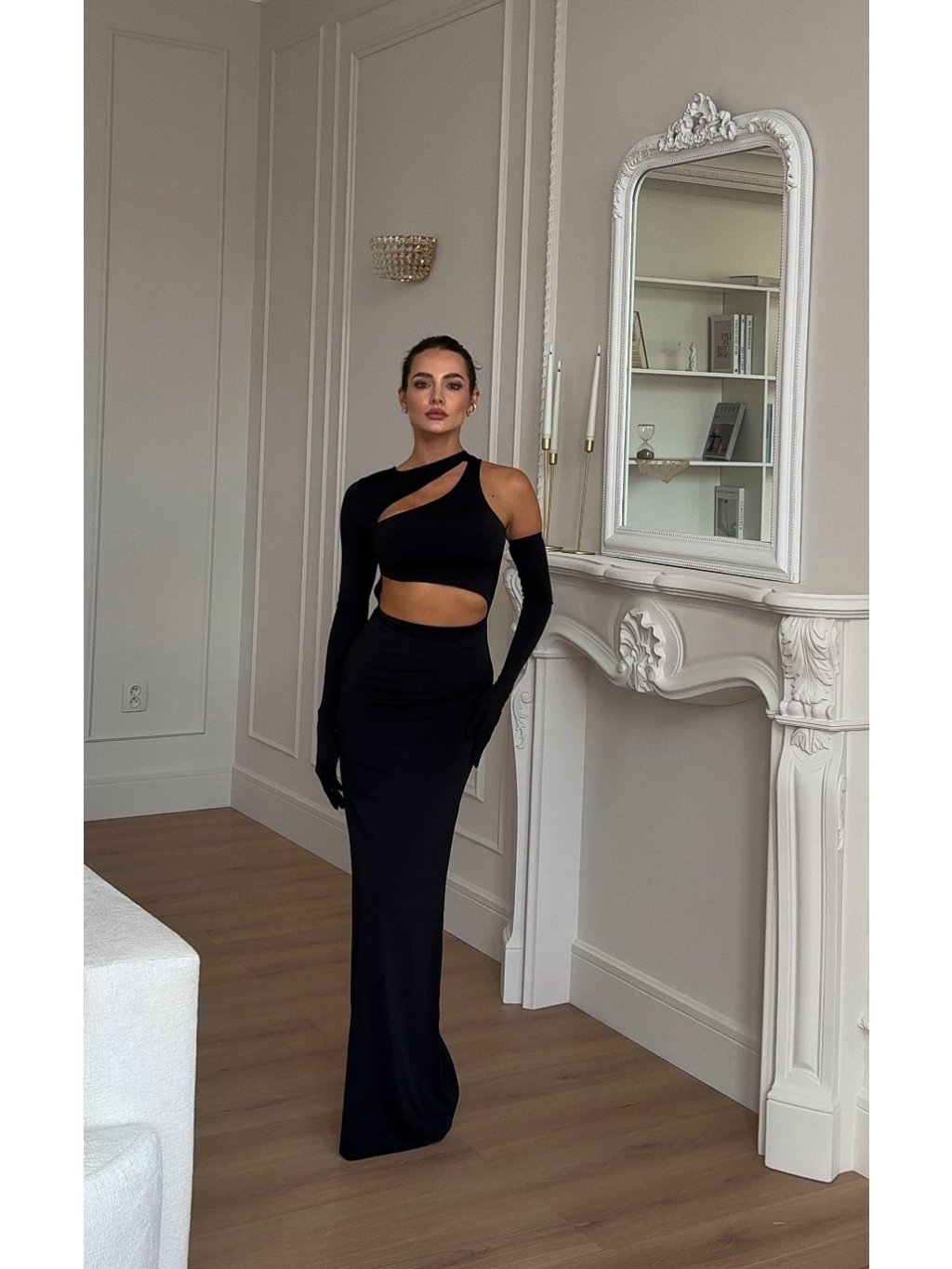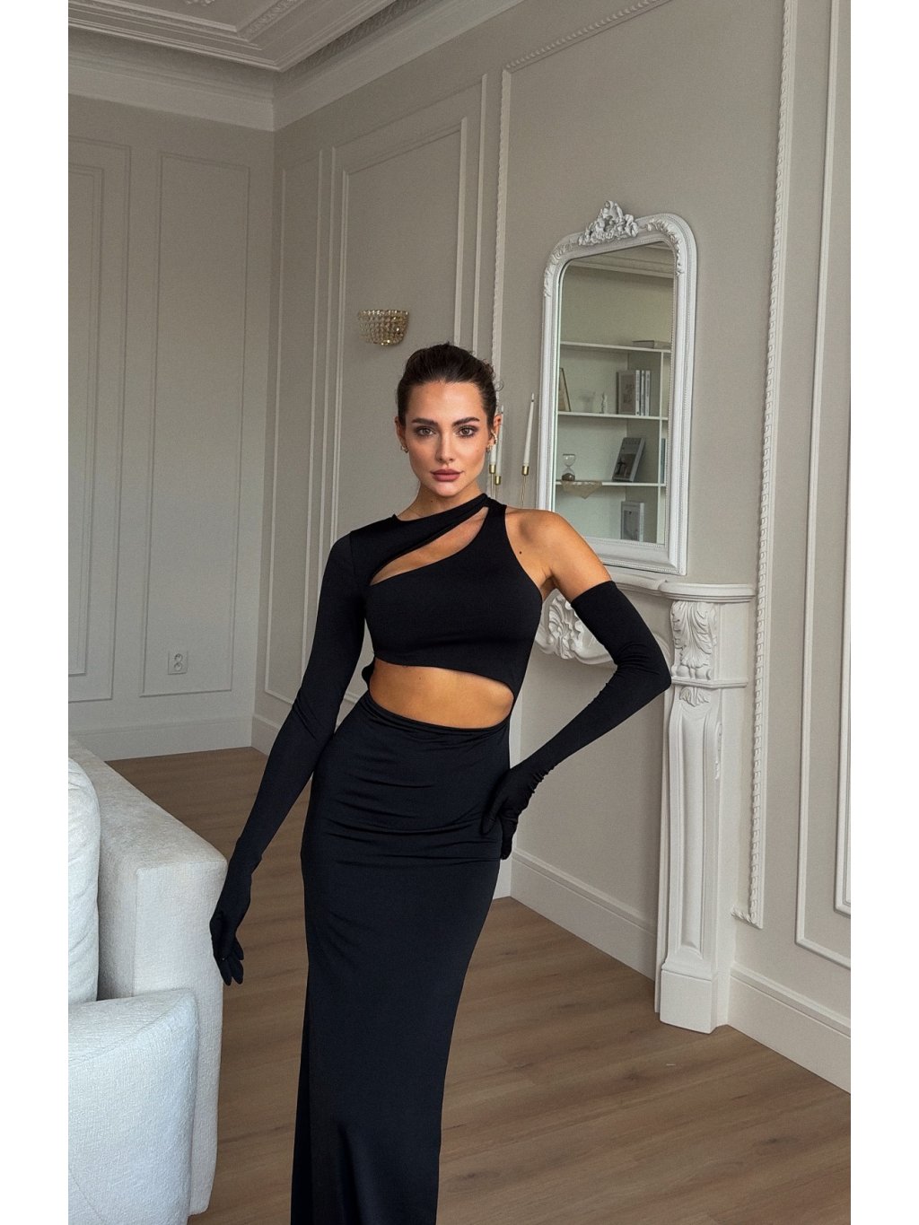 Tyto černé šaty jsou elegantní, sexy a velmi úplé, dokonale kopírují siluetu a zdůrazňují ženskou postavu. Originální rukavičky dodávají šatům sofistikovaný a odvážný detail. Ideální volba na večerní akce, stylové večery nebo speciální příležitosti, kdy chcete působit sebevědomě a výrazně. Vhodné na drobnější postavy.